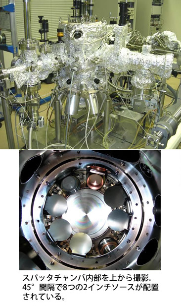 設備概要 | 2インチカソード8本 試料サイズ30 mm角 RF電源 500 W 2台 基板加熱:600℃ 1 kV Arイオンエッチング機構 試料交換室に8サンプルバンク可 | |||