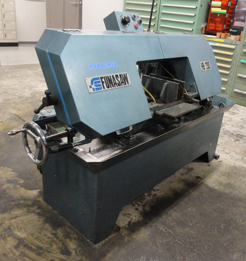 設備概要 | 帯状の鋸刃が回転し、金属、樹脂などをバイスで固定し、直線状に切断する機械で、円筒形の部材にも使用できる | |||