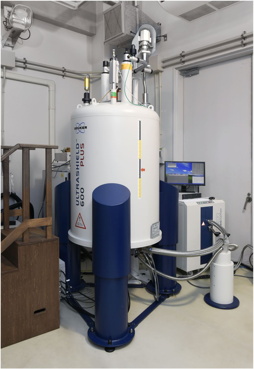 設備概要 | AVANCE III 600は主にタンパク質をはじめとする生体高分子の立体構造解析・運動性の解析、相互作用部位の同定等に使用可能である。クライオプローブによる測定感度の飛躍的に向上している。磁場強度は14.0 T(水素の共鳴周波数 600 MHz)で、1H、13C、15N、31P、2H 核を照射し、1Hで高感度の測定を行う多重共鳴測定が可能である。 | |||