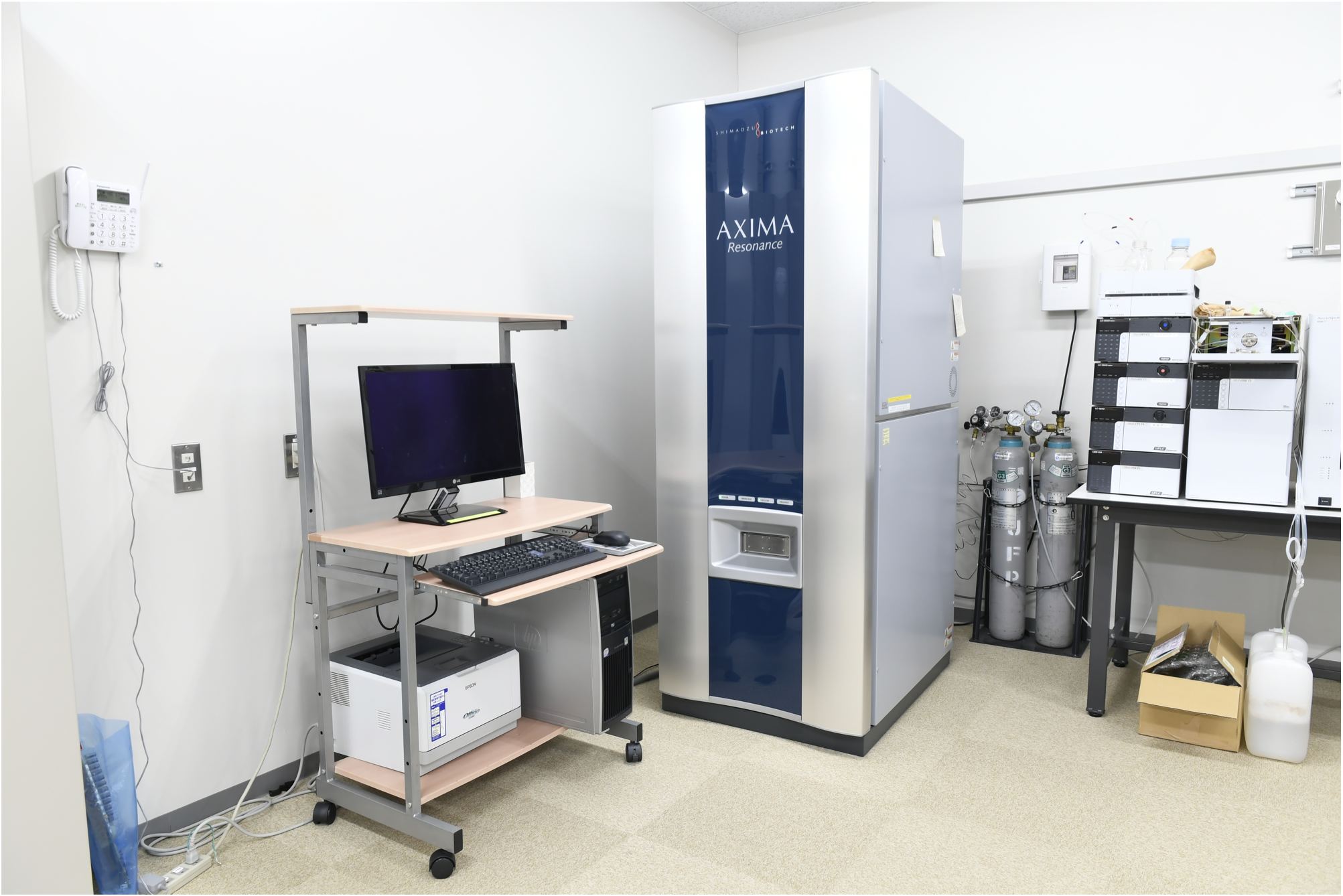 設備概要 | AXIMA-Resonanceで用いるMALDI法は代表的なソフトイオン化法で、生体高分子(ペプチドや糖質)の質量分析ができる。マトリックス試料は、波長337 nmの窒素レーザー光により、その最表面(~ 100 nm)が数nsecで急速加熱され、気化される。四重極イオントラップ(QIT)を使用しており、イオン化時での初期エネルギーのばらつきによる精度の低下を防いでいる。また、QITにより試料の連続的な開裂が可能となり、糖質などの構造解析に必要な多段階MSスペクトルが得られる。 | |||