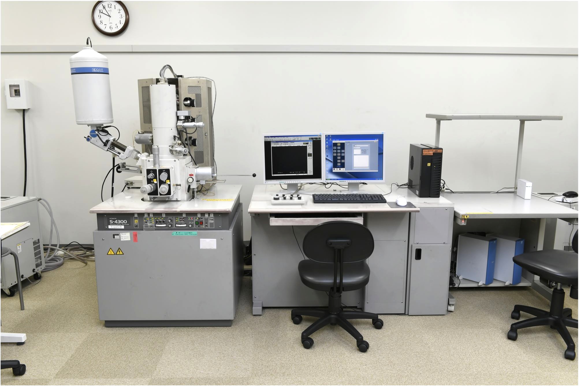 | 設備概要 | S-4300は電界放出型電子銃(FEG)を備えた装置で、加速電圧は0.5 ~ 30 kVの範囲で可変することが可能であり、倍率は20 - 500,000倍、分解能は1.5 nm(15 kV)および 5.0 nm(1 kV)である。高輝度な電子銃により、低加速電圧、例えば、1 kVでも高分解像を得ることが可能である。また、低加速電圧にて、無蒸着観察できる試料もある。装備されたX線分析装置EX-220は炭素などの元素分析ができる。 | |||