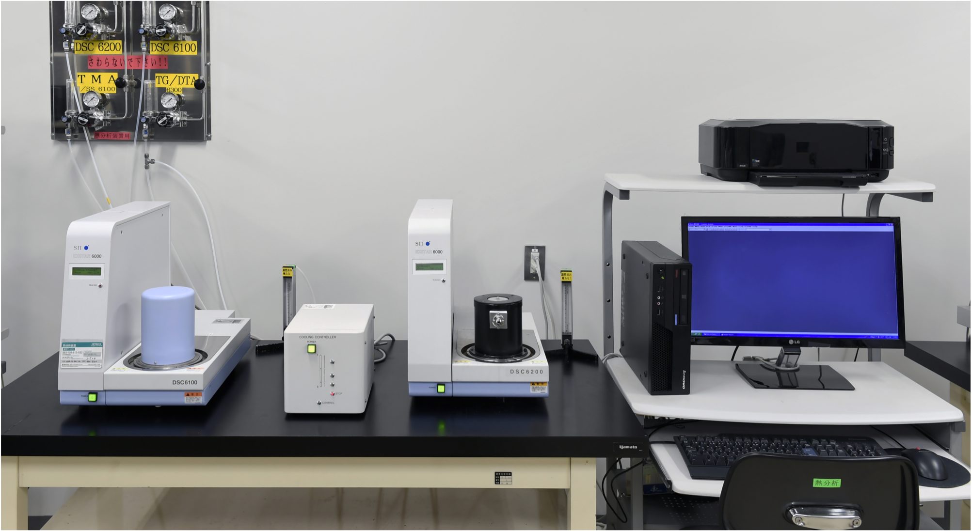 設備概要 | 示差走査熱量計(DSC)は、試料の状態変化による吸熱反応や発熱反応を測定する装置である。DSC6100(左;温度範囲:-150 ~ 500ºC)は生命科学におけるタンパク質溶液などの高感度測定用である。冷却は液体窒素溜めクーリングカンを使用する。試料の吸熱・発熱に伴う熱流の変化を検知し、熱容量、反応温度などが測定できる。 | |||