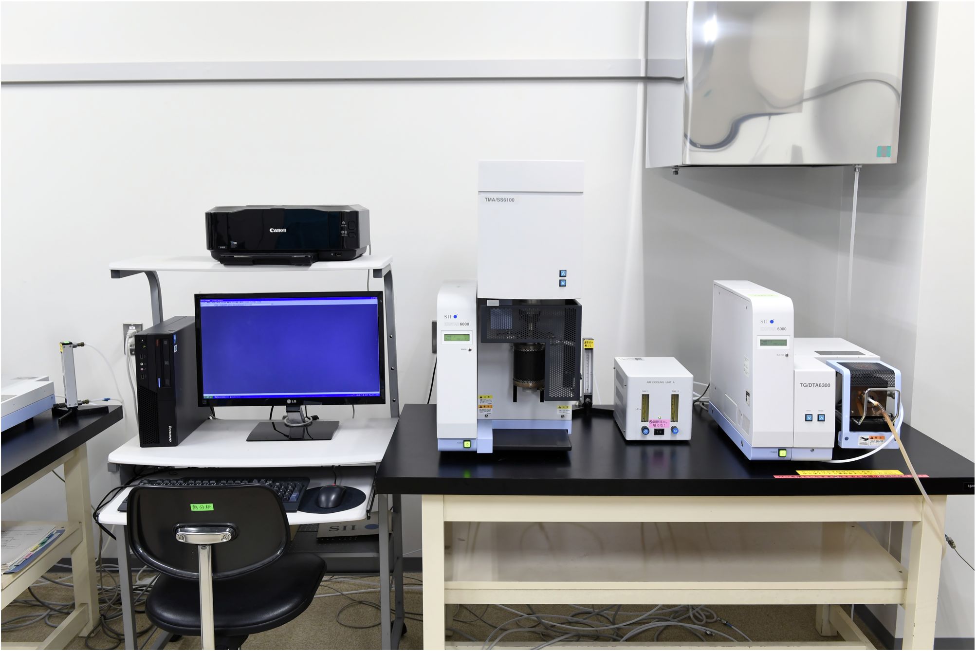 | 設備概要 | 熱重量・示差熱同時測定装置(TG/DTA, 右)は、試料の加熱に伴う重量変化を検出し、基準物質との温度差を温度関数として測定する装置である。TG/DTA6300 は温度をプログラムに従って変化させながら、試料の重量変化と吸熱・発熱を測定することができる装置である。安定性に優れかつ高感度な水平差動方式を採用しており、測定範囲は室温から1500°Cまで、TG の感度は 0.2 μg、試料量は 10 mg 程度である。熱安定性や熱分解挙動を評価することができる。 | |||