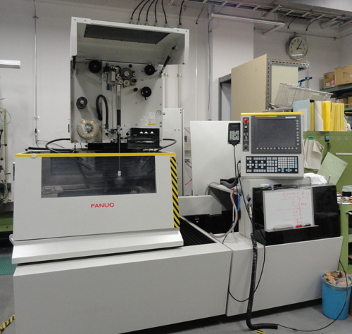 設備概要 | 細いワイヤーと材料間に放電を発生させ、高精度に切断加工を行う工作機械、テーブル移動量:X=600、Y=400、Z軸ストローク:410 | |||
